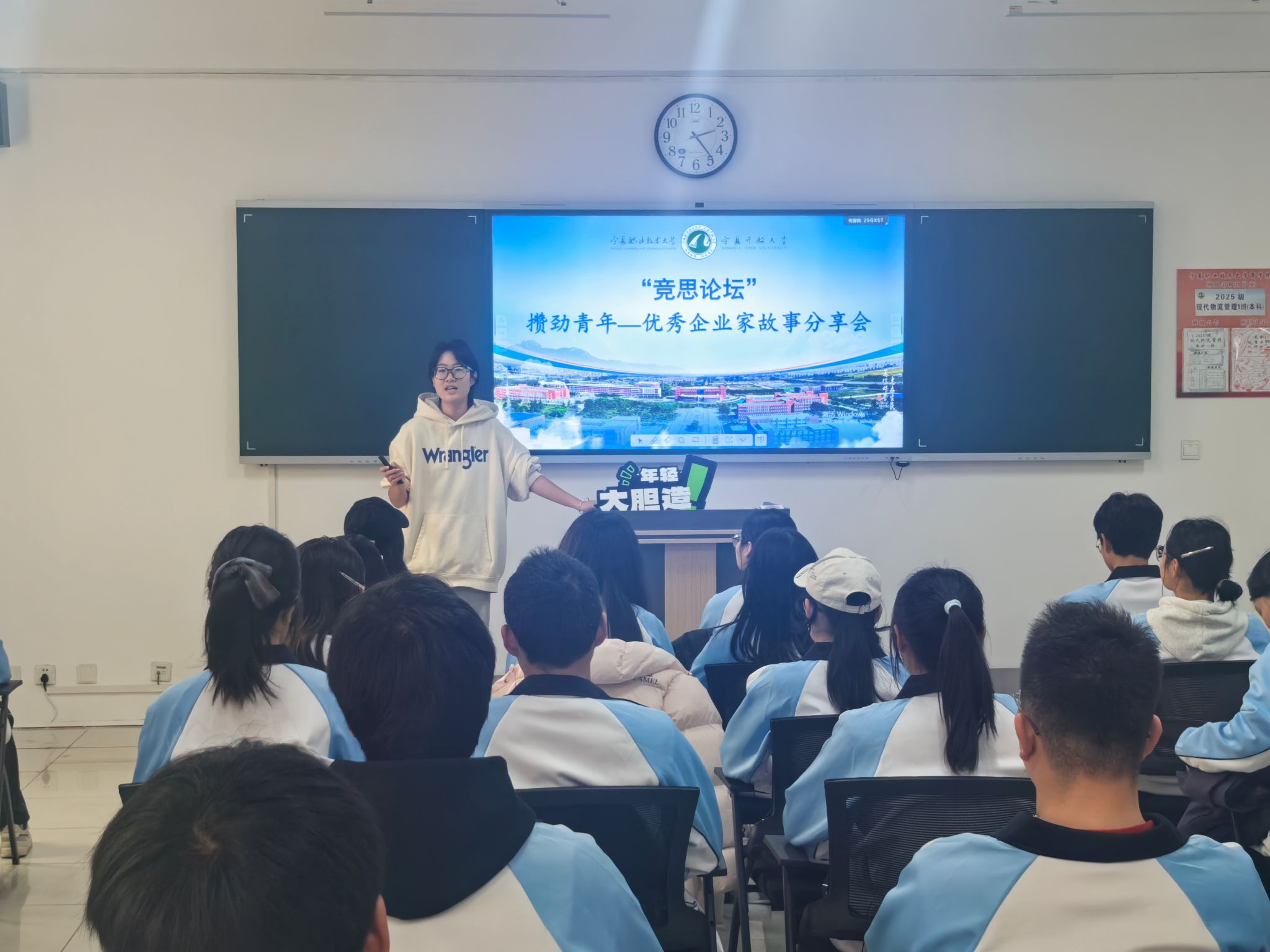 11月11日下午,由我校联合共青团银川市委员会主办、C公益与“攒劲青年”团队承办的“竞思论坛”暨攒劲青年—优秀企业家故事分享会在学校竞智楼A324成功举办。本次活动特邀银川市青年创业先锋、资深运营专家马宇欣女士作专题分享,就业与合作交流处相关人员与商学院50名学生参加活动。