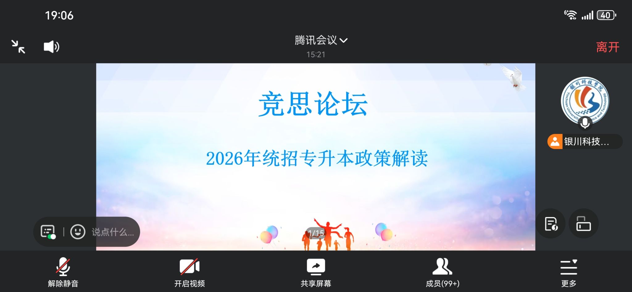 12月4日,我校开展线上“竞思论坛”专升本政策宣传讲座。本次讲座特邀银川科技学院招生办公室主任杨文君进行专题辅导,吸引了两百多名学生在线参与,收效良好。